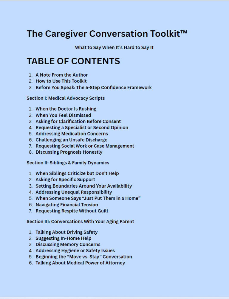 “I created a full Caregiver Conversation Toolkit with scripts for doctors, siblings, aging parents, and emergencies.”